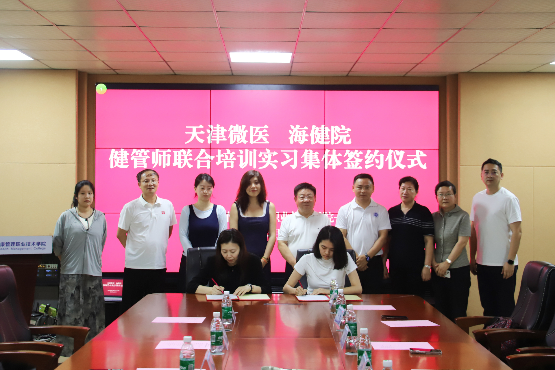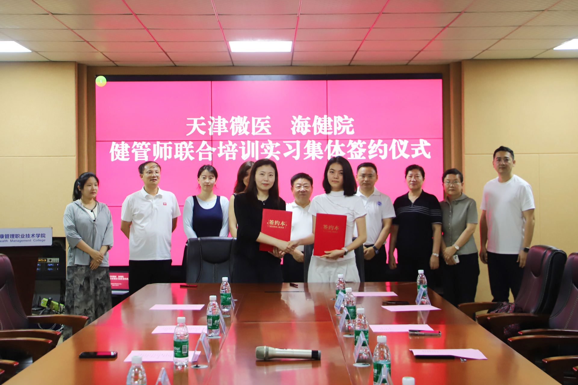 為深化產教融合、協同培育健康管理人才,搭建院校與企業精準對接的育人平臺,4月24日,天津微醫與海健院健管師聯合培養實習集體簽約儀式在金江校區第二會議室順利舉行。天津微醫人力資源總監張楠、微醫控股健管主管劉依娜企業團隊一行,學院院長谷道宗、教學副院長以及相關部門負責人、16名參加培訓的學生共同出席儀式。儀式由教學副院長主持。